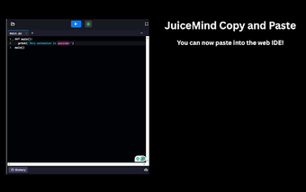 JuiceMind Copy and Paste เป็นส่วนเสริมฟรีสำหรับ Chrome ที่ช่วยเพิ่มประสิทธิภาพให้กับ JuiceMind IDE โดยการแนะนำฟังก์ชันการคัดลอกและวางที่สำคัญ เครื่องมือนี้ช่วยให้ผู้ใช้สามารถถ่ายโอนข้อความและโค้ดได้อย่างง่ายดายใน IDE ทำให้กระบวนการพัฒนาง่ายขึ้น ด้วยฟีเจอร์นี้ ผู้ใช้สามารถทำงานได้อย่างมีประสิทธิภาพมากขึ้นโดยไม่ต้องยุ่งยากกับการพิมพ์ใหม่ด้วยมือ ทำให้เป็นการเพิ่มมูลค่าที่สำคัญสำหรับนักพัฒนาทั้งมือใหม่และมืออาชีพ